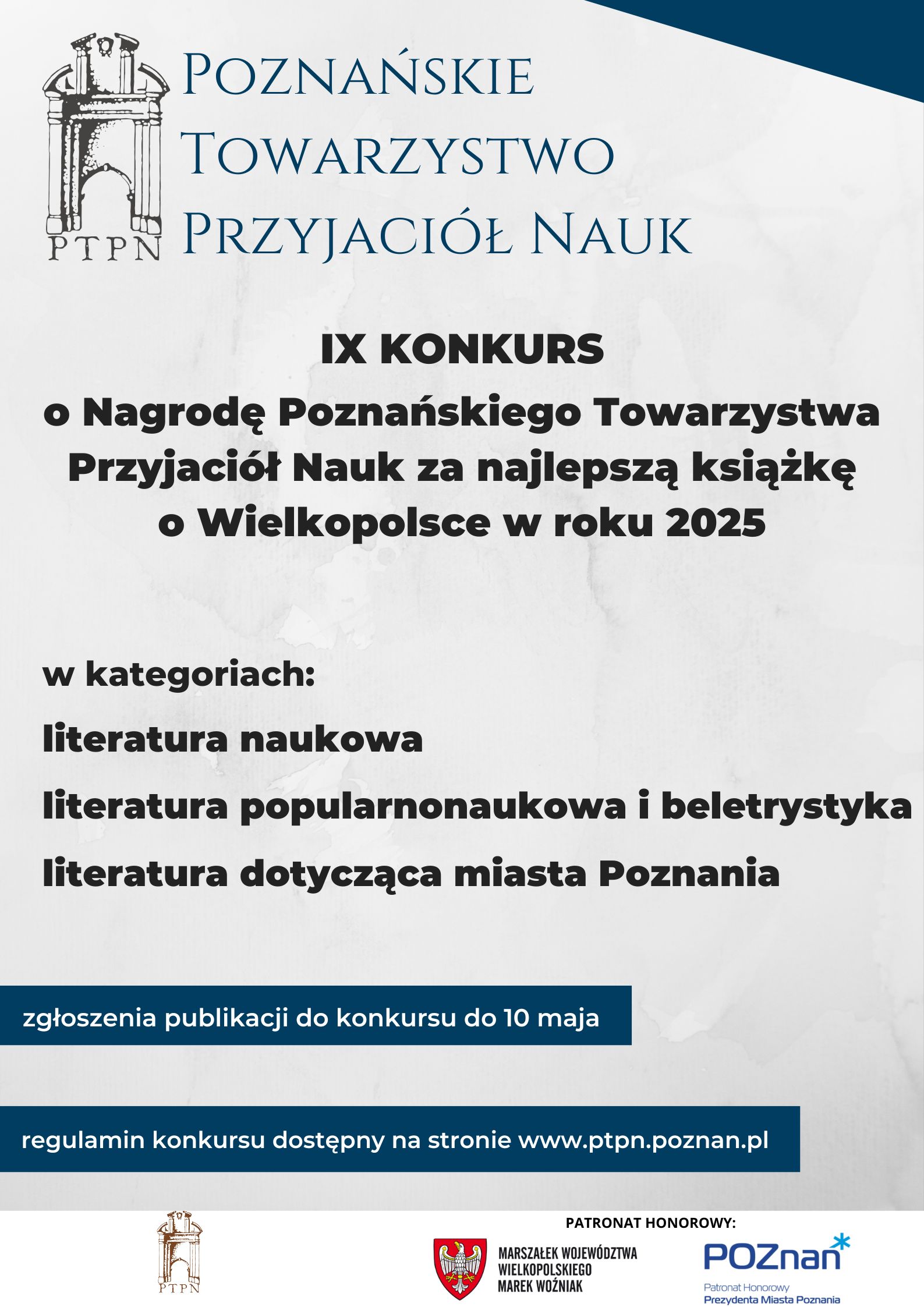 jest nam niezmiernie miło poinformować o ogłoszeniu ósmej edycji Konkursu o Nagrodę Poznańskiego Towarzystwa Przyjaciół Nauk na najlepszą książkę o Wielkopolsce w roku 2025. Celem ustanowionej nagrody jest wyróżnienie i promocja najważniejszych dzieł, które podejmują tematy związane z Wielkopolską oraz propagowanie czytelnictwa i popularyzacji wiedzy o regionie.
