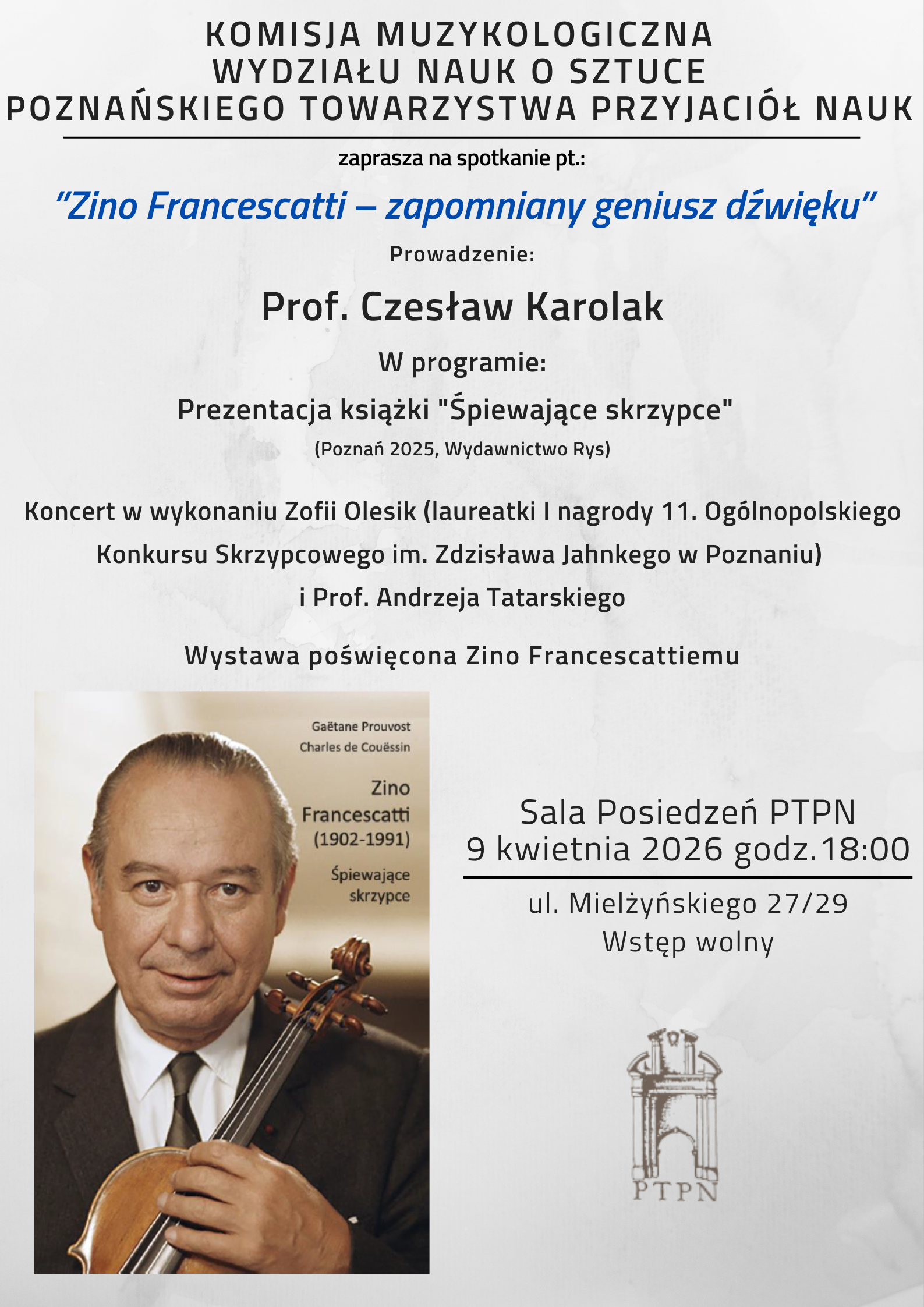 Komisja Muzykologiczna Wydziału Nauk o Sztuce Poznańskiego Towarzystwa Przyjaciół Nauk zaprasza na spotkanie pt.: