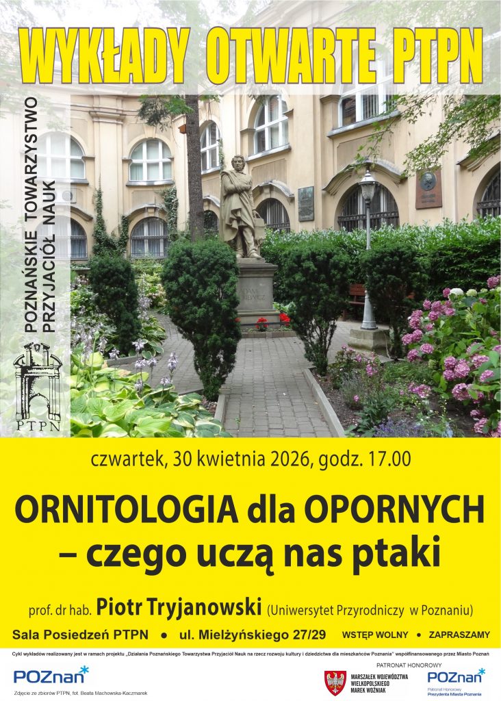 Zapraszamy na wykład pt. „Ornitologia dla opornych – czego uczą nas ptaki”, prof. dr hab. Piotr Tryjanowski (Uniwersytet Przyrodniczy w Poznaniu). Wykład odbędzie się 26 marca o godz. 17 w Sali Posiedzeń PTPN, przy ul. Mielżyńskiego 27/29 w Poznaniu (wejście od dziedzińca po lewej stronie). Wstęp wolny.