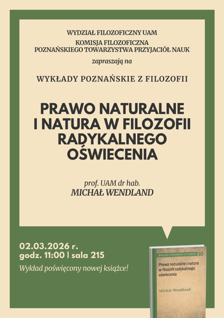 Wydział Filozoficzny UAM oraz Komisja Filozoficzna Poznańskiego Towarzystwa Przyjaciół Nauk zapraszają na Wykłady Poznańskie z Filozofii poświęcone nowej książce prof. UAM dr hab. Michała Wendlanda „Prawo naturalne i natura w filozofii radykalnego oświecenia”. Spotkanie odbędzie się 2 marca 2026 r. o godz. 11:00 w Sali 215 (Aula im. K. Ajdukiewicz) w gmach Wydziału Filozoficznego UAM w Poznaniu, ul. Szamarzewskiego 98, Budynek C.